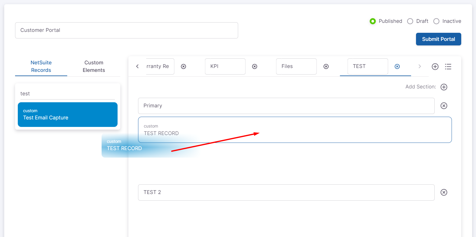- Using the records list on the left hand side drag the record type you want to add into the portal builder workspace