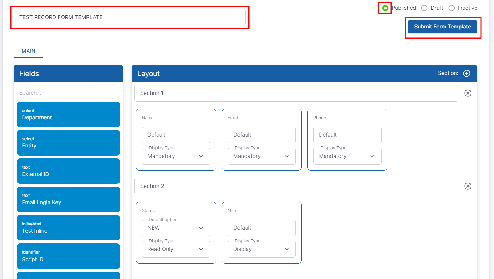 - Once you have added all the fields and sections to your form, give your form a name, change the status to published and click Submit