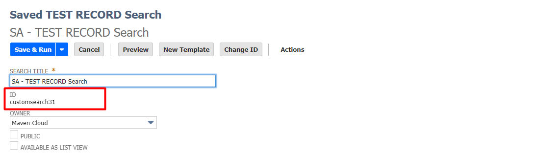 - Once you have built the Saved Search in your NetSuite environment, take note of the Saved Search ID as it will be used later. If you need help creating a Saved Search please review the NetSuite documentation on how to do so.
