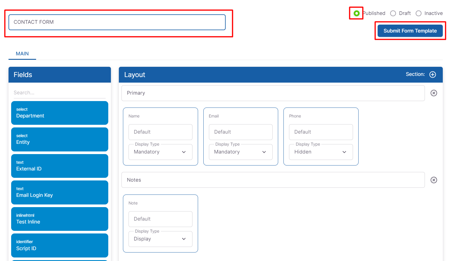 - Once you have added all the fields and sections to your form, give your form a name, change the status to published and click Submit
