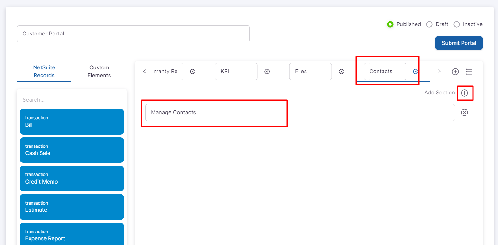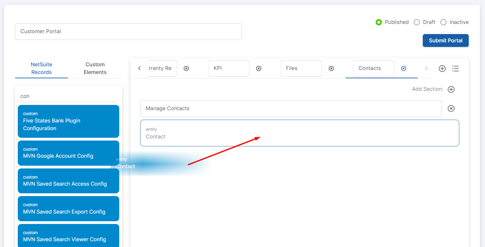 - Using the records list on the left hand side drag the record type you want to add into the portal builder workspace