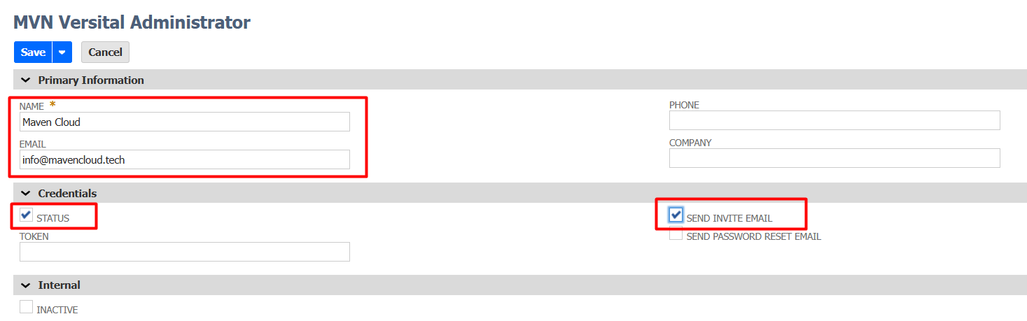 - Enter the Name and Email address for this Administrator. Mark the Status checkbox and mark "Send Invite Email", then Save the record.