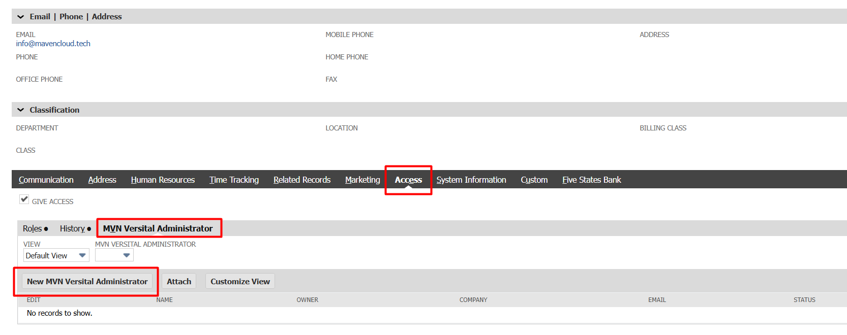 - In NetSuite navigate to the Employee record that you want to give access to VERSITAL to. Then on the Access subtab click "New VERSITAL Administrator"