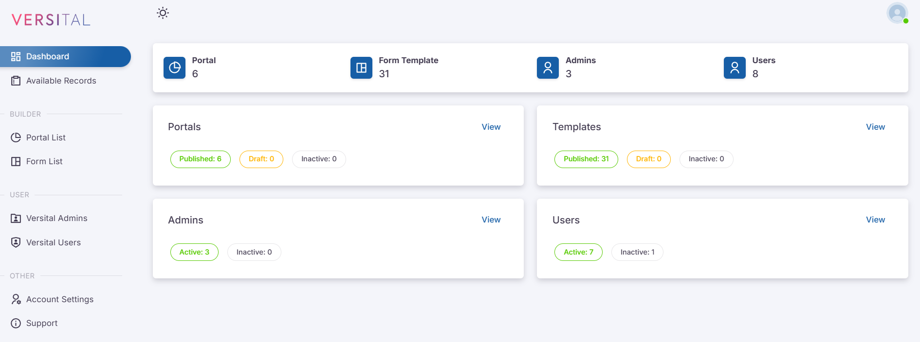 - Once successfully logged in you will see the VERSITAL Admin dashboard.